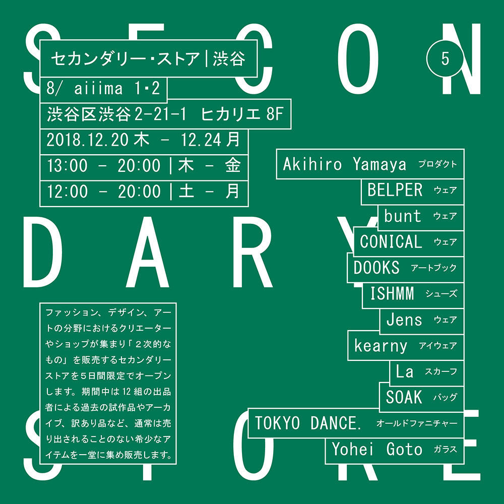 ファッション、デザイン、アートの分野におけるクリエーターやショップが集まり「2次的なもの」を販売するセカンダリーストアを5日間限定でオープンします。期間中は12組の出品者による過去の試作品やアーカイブ、訳あり品など、通常は売り出されることのない希少なアイテムを一堂に集め販売します。