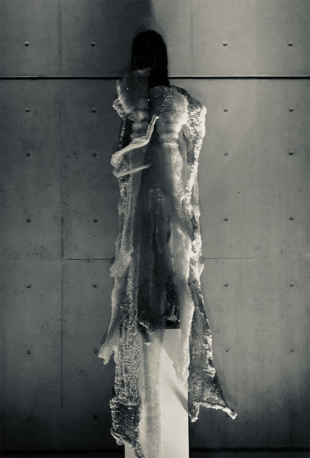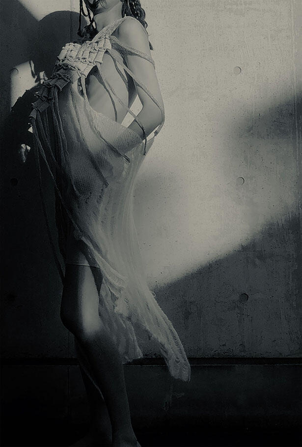 自己をめぐる視線と心理の関係から考察された人の美しさの表現を、ニットの技術と素材の特性、衣服の形状を用いてそれぞれ作品を制作。