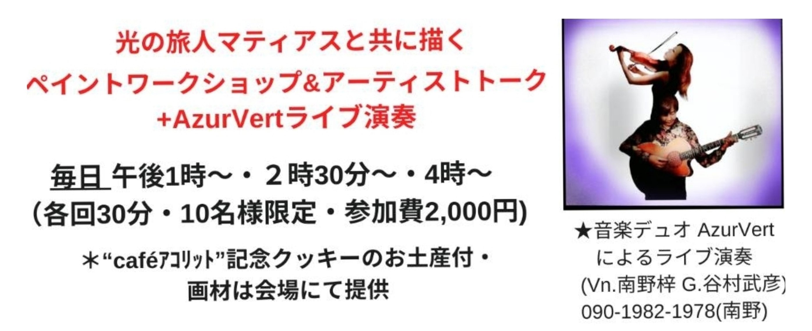 展覧会とアートワークショップのイベント(会期中毎日13時、14時半、16時に10名限定で、マティアスとの絵画作成、トーク、音楽演奏)を30分程度開催いたします。