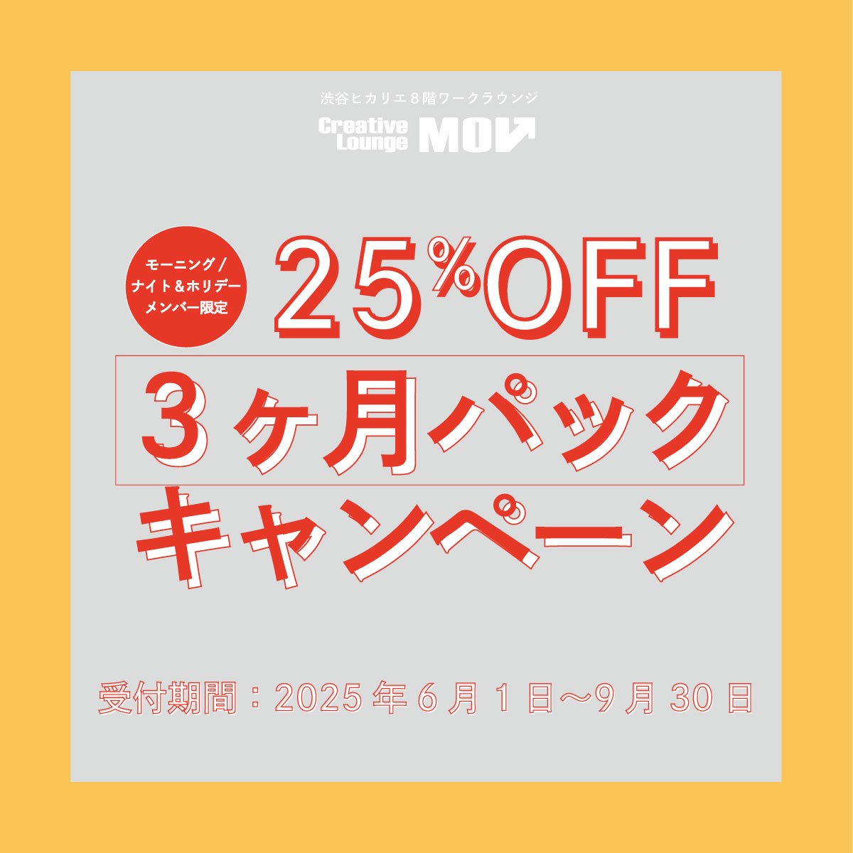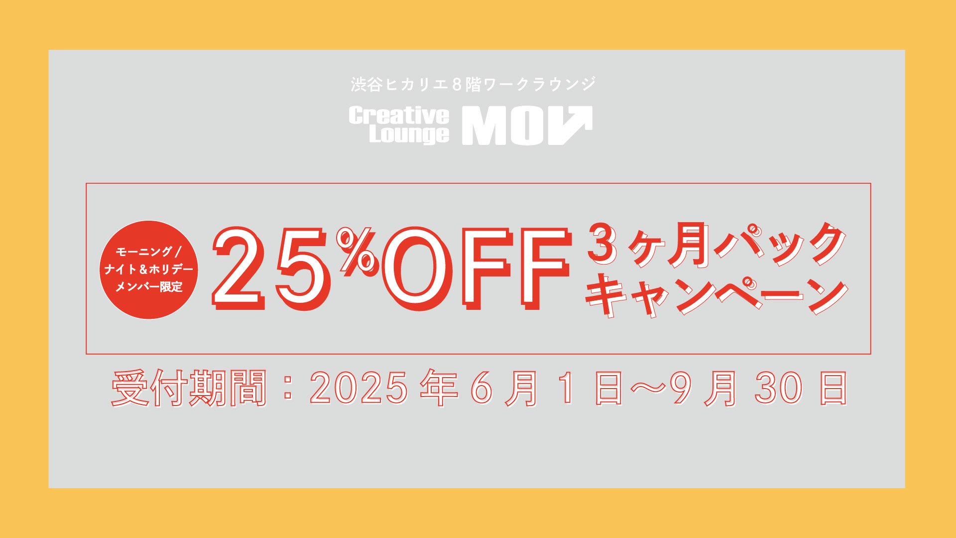 平日午前中と週末にご利用いただけるモーニング&ホリデー、平日18時以降と週末にご利用いただけるナイト&ホリデー。どちらかのプラン限定で、MOVを3ヶ月間・25%OFFでお得にご利用いただけるキャンペーンです。午前中や夕方以降は、ラウンジの混雑もなく、集中していただきやすい時間帯となっています。ぜひこの機会をご利用ください。| メンバータイプ | 利用時間 | 入会金 | 月額料 | 3ヶ月料金 |