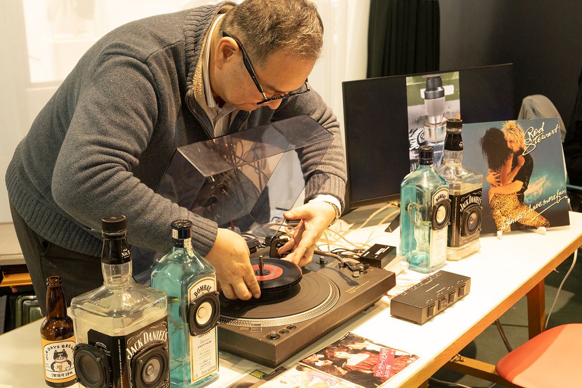 酒瓶をくり抜いてスピーカーを自作するマッドサイエンティストの濱田さん。同テーマで2回目の出展。前回よりパワーアップしてました!