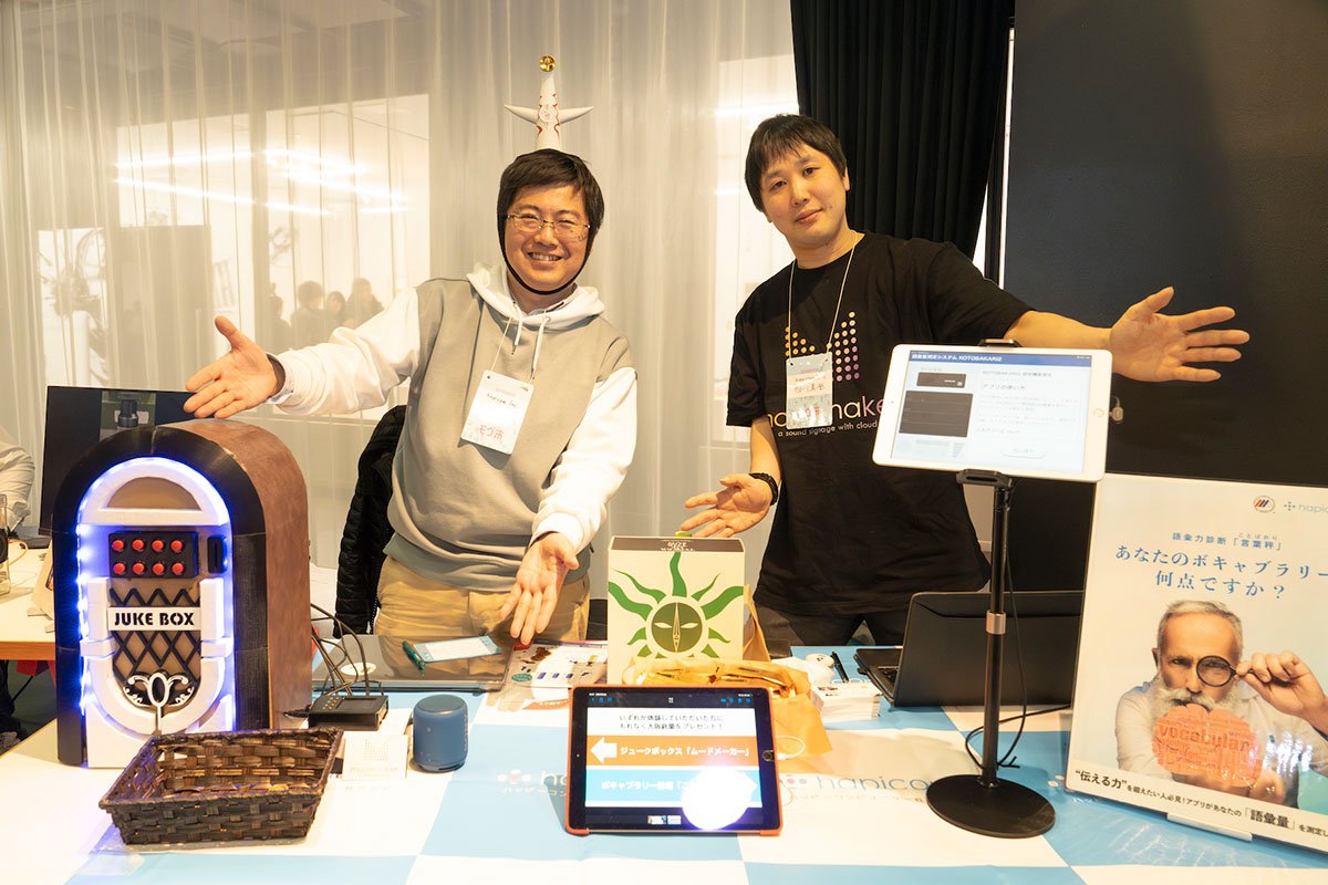 デジタルの"料理人"、大阪から遠征くださったハッピーコンピューター株式会社さん。MOVのBGMでも使わせていただいている『moodmaker』と、語彙力を測れちゃうアプリ『KOTOBAKARI2(言秤)』で初出展!まさしくおふたりがムードメーカー!