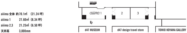 Creative Lounge MOVのエントランスに位置する3つのショーケースaiiima(アイーーーマ)。