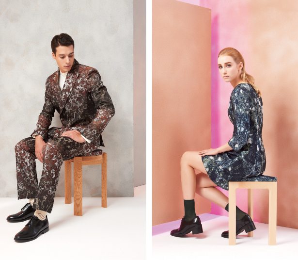 メンズスーツとワンピースは、ビンテージのシルエットを用いた新しいスタイルを提案。