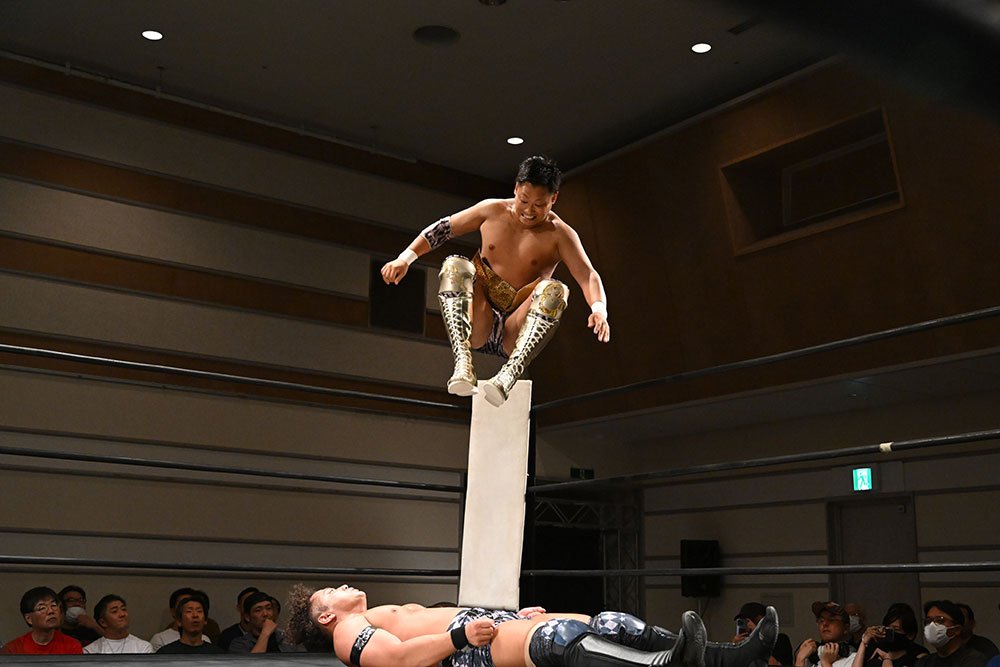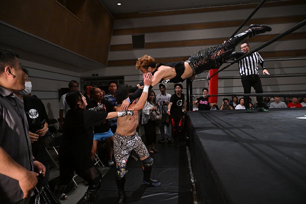 すごい高さから技を仕掛ける渡瀬瑞基選手。いい子はまねしちゃダメなやつ(*ガンバレ☆プロレスさんご提供)
