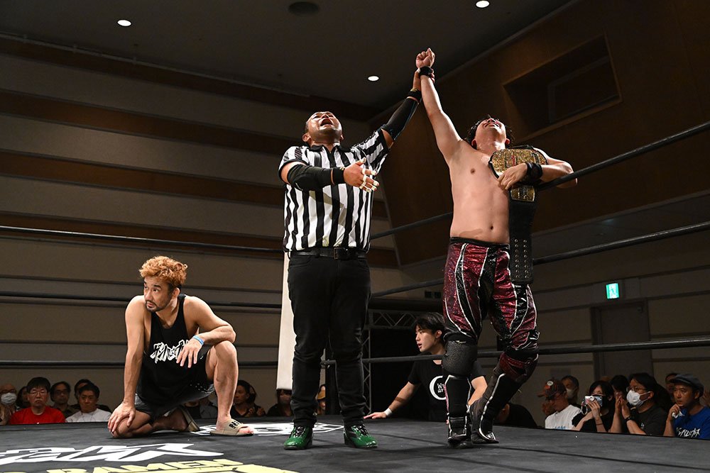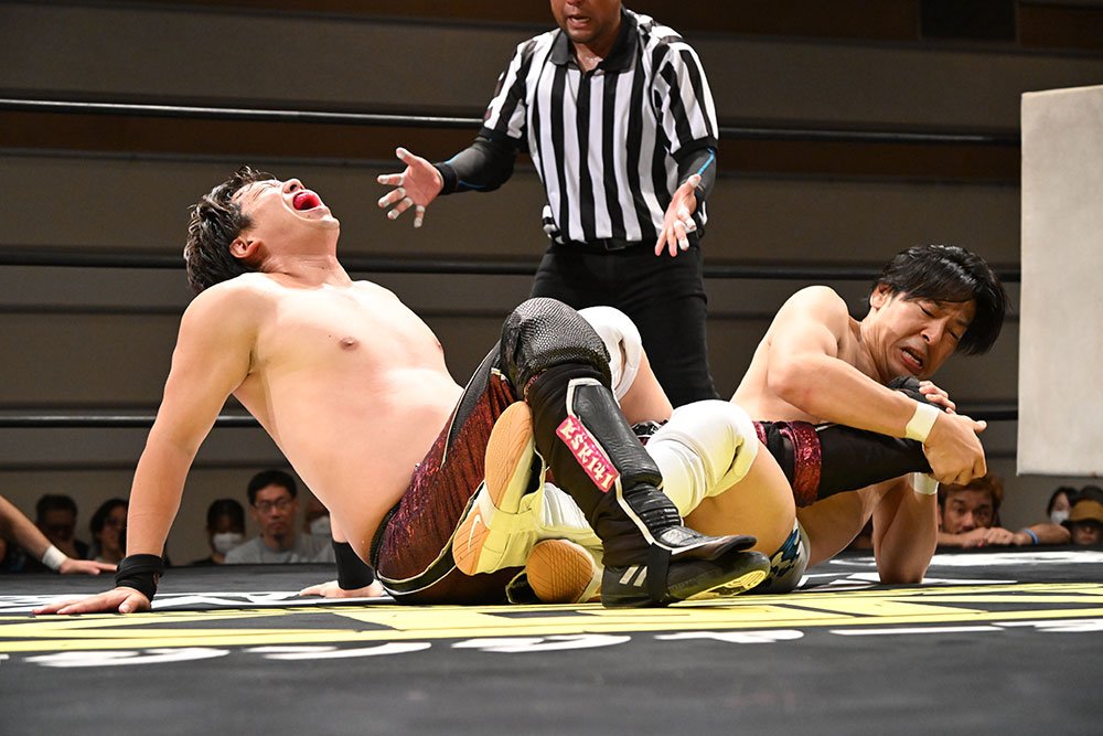 大トリはスピリット・オブ・ガンバレ世界無差別級選手権。挑戦者で元総合格闘家 和田拓也選手は絞め技で攻める...!(*ガンバレ☆プロレスさんご提供)