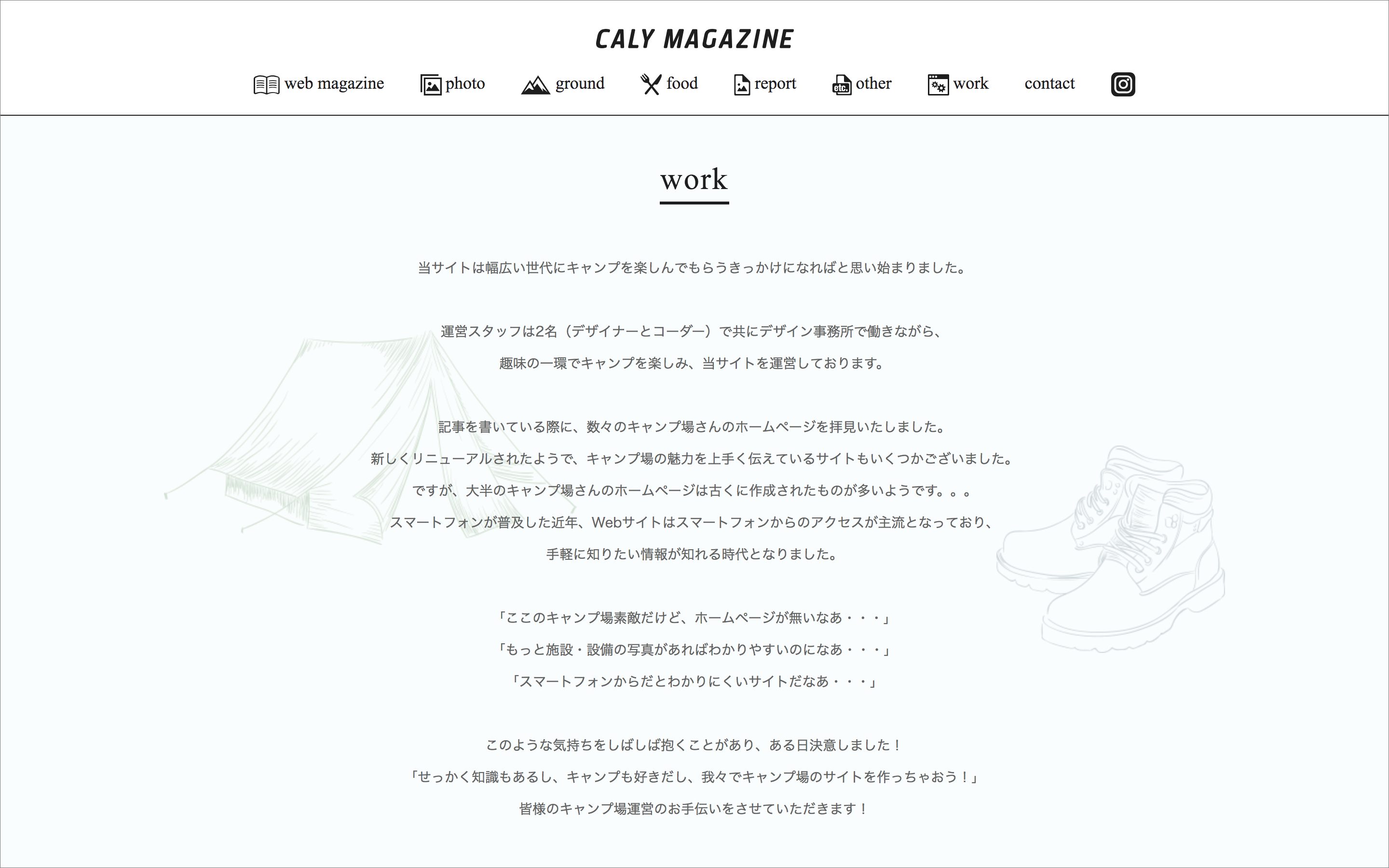 学生時代からの友人である二人が、ふとしたきっかけでキャンプに大ハマり。自分たちのスキルを活かして、キャンパーのためのWEBメディア CALY MAGAZINE(キャリーマガジン) をたちあげた。どうやらこれが、すごくいい、らしい。
