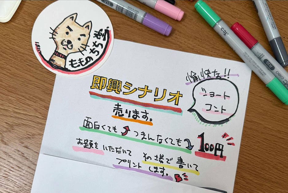 MOV市では、「即興シナリオ」を4回くらい出展しています。お客さんからお題をもらい、その場でA4サイズ1枚くらいのショートコントを、15分程度で書くものです。