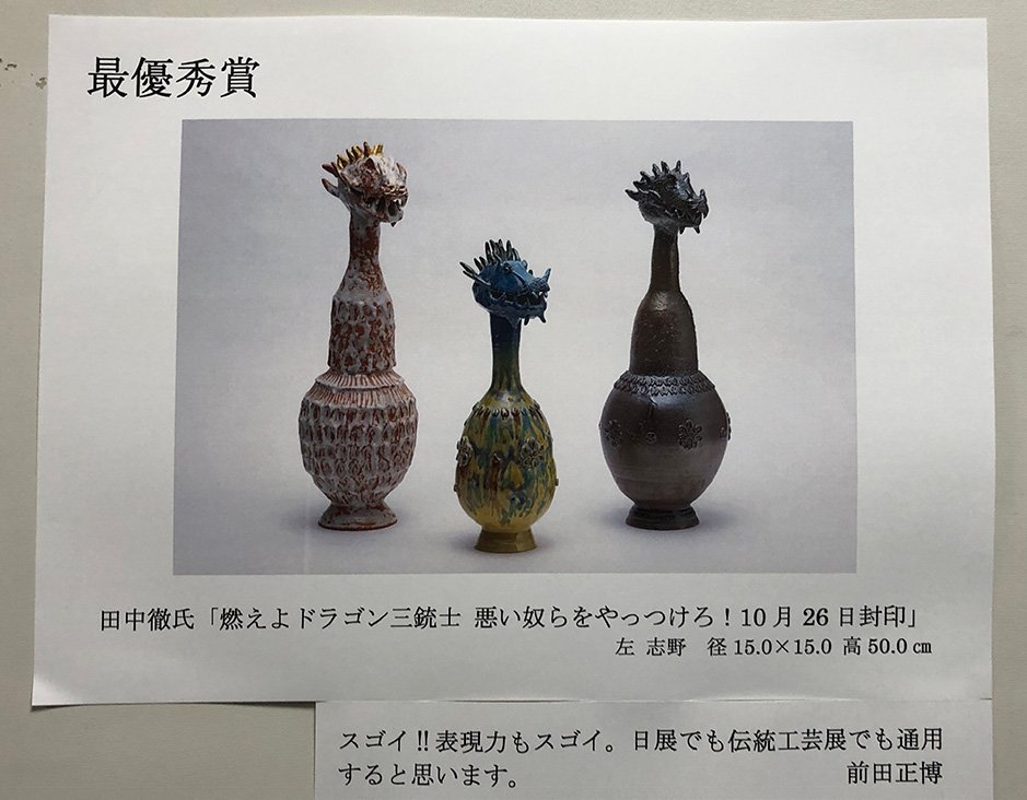 2024年秋の「日本陶芸倶楽部アマチュア作品展」では、唐三彩をいま風にアレンジした龍の作品「燃えよドラゴン三銃士 悪い奴らをやっつけろ!」を出品し、183点の中から最優秀賞を取りました。
