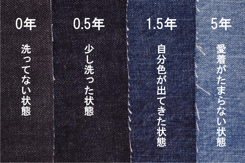 ▲セルビッチデニムの経年によるおよその色落ちの様子。どんどんあなた色になっていく。
