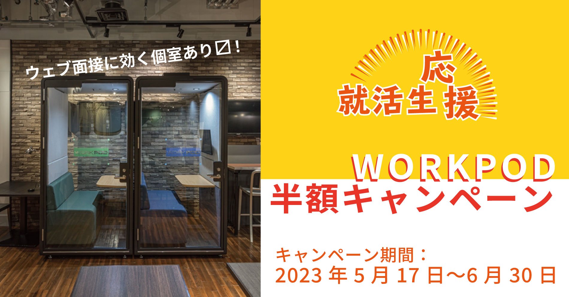 就職活動をされている学生さんを対象に、WEB面接に最適なフォンブース型ひとり用会議室『WORKPOD(ワークポッド)』を、期間中、通常価格の半額でご提供するキャンペーンです。受付時に学生証をご提示いただくだけでご登録&ご利用していただけます。