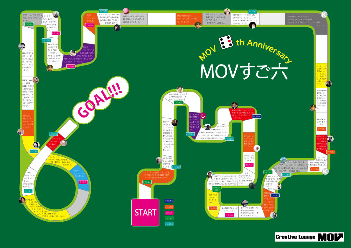 社会人になってから経験した、冷や汗ものの失敗や、赤っ恥エピソードを中心に、MOV&ノマドあるあるも詰め込んだ、オリジナリティあふれるすごろくになりました。