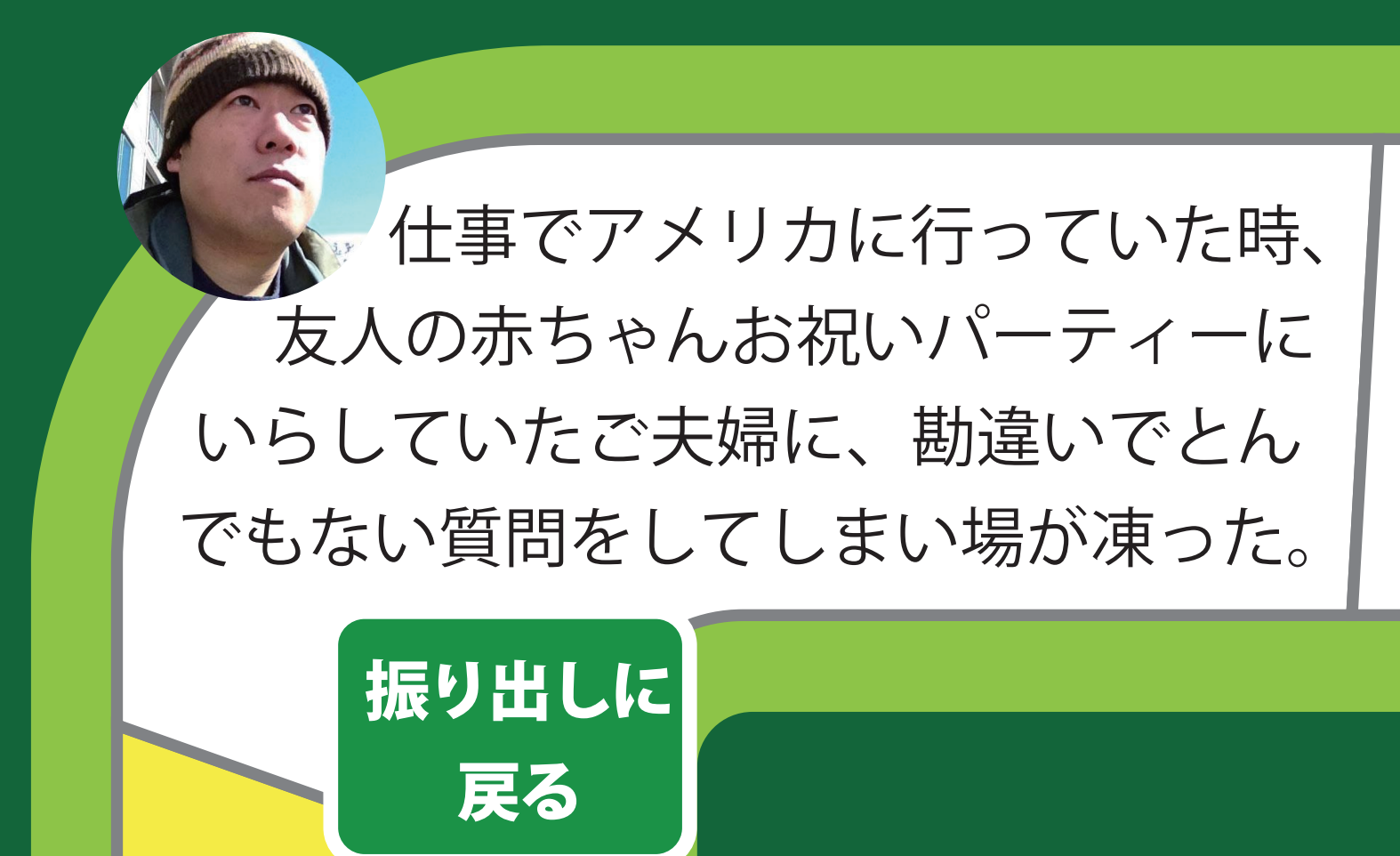 お腹まわりがすこしふくよかだった奥様に「妊娠何ヶ月目ですか?」と質問。たっぷり3秒沈黙したあと「わたし妊娠してません」。ヒョェェェェェェェ・・・【振り出しに戻ろう】