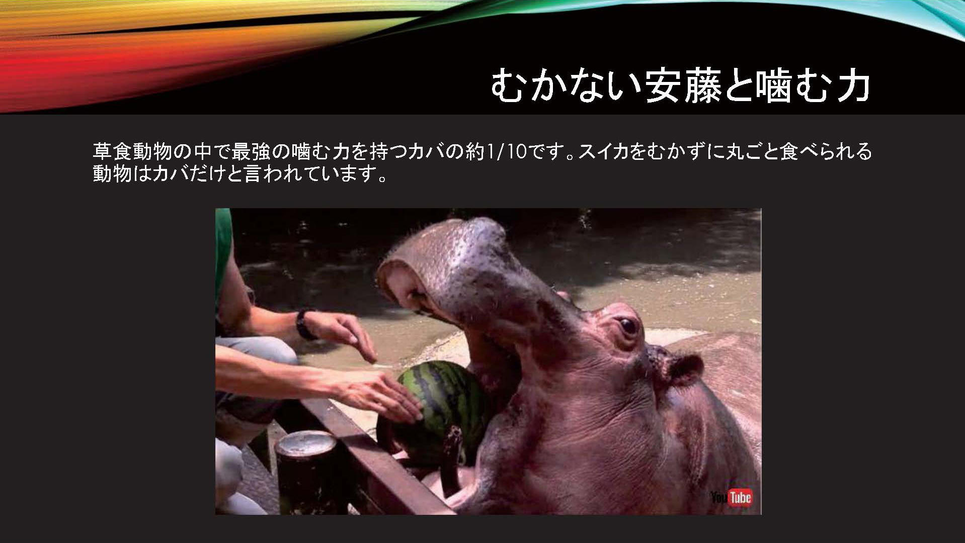 カバね。あらゆる生き物の中で、唯一スイカを丸かじりできるのはカバなんですって。なんでかって言うと、噛む力が僕の10倍あるから。僕は100キロぐらいだったのが1000キロ。1トンぐらいの力があるから噛み砕ける。あと、カバっていうのはすごく特殊な顎をしていて、ほぼ180度開くんです。動物園とかでみると、パカってあいた中に餌投げ込んでるんです。顎が特殊で、開くので、噛み砕ける。動物の中で唯一スイカまるごと食べれるのは、むかない安藤とカバ。