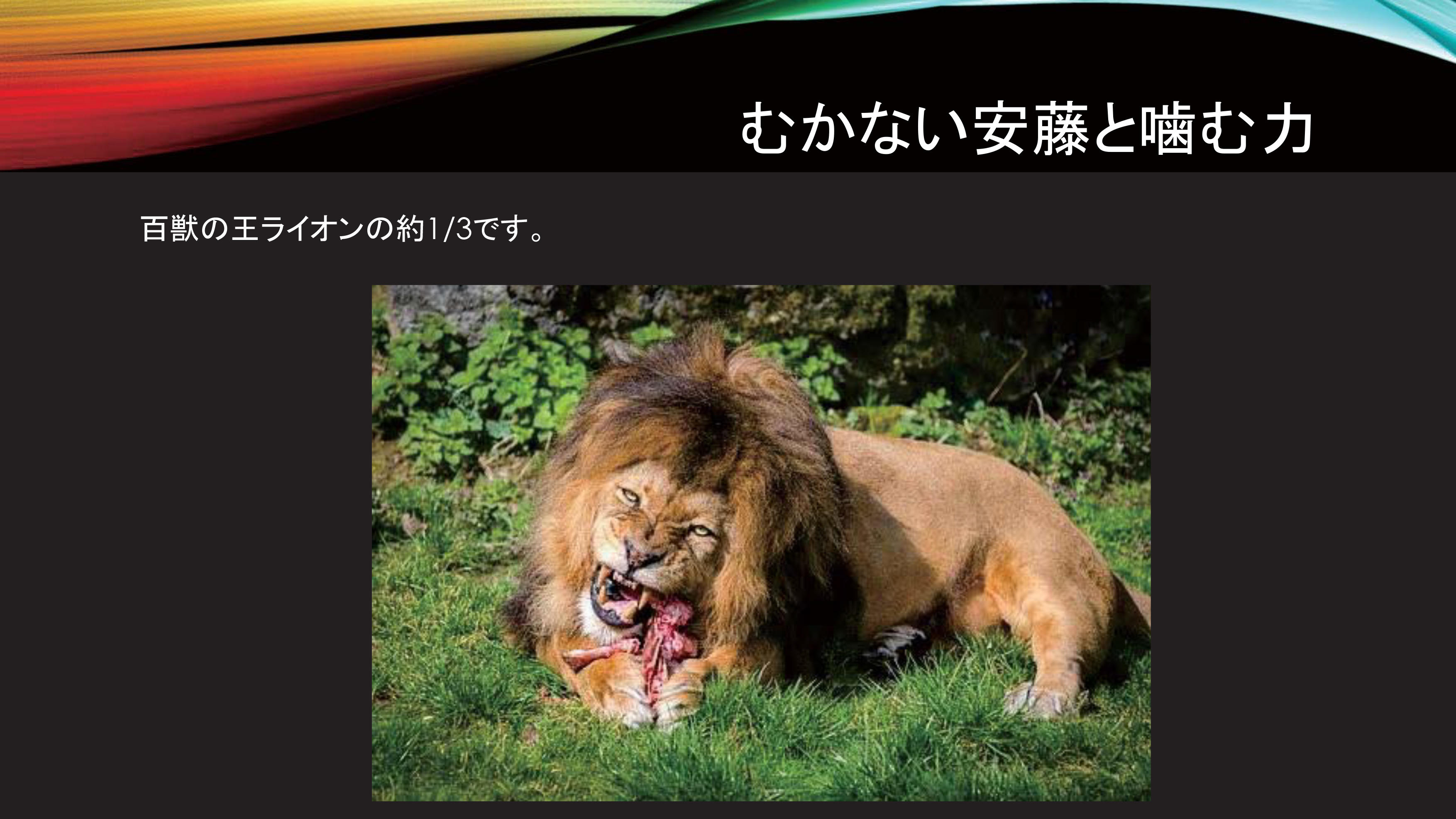 こんな顔してるけど、ライオンって意外と、むかない安藤の3倍ぐらいなんですよね。聞いてわかると思うんですけど、人間て、そこそこ強いんですね、噛む力が。ライオンの3分の1の力が出せるぐらい強いので、ま、まだまだいけるなっていうのがありますよね。