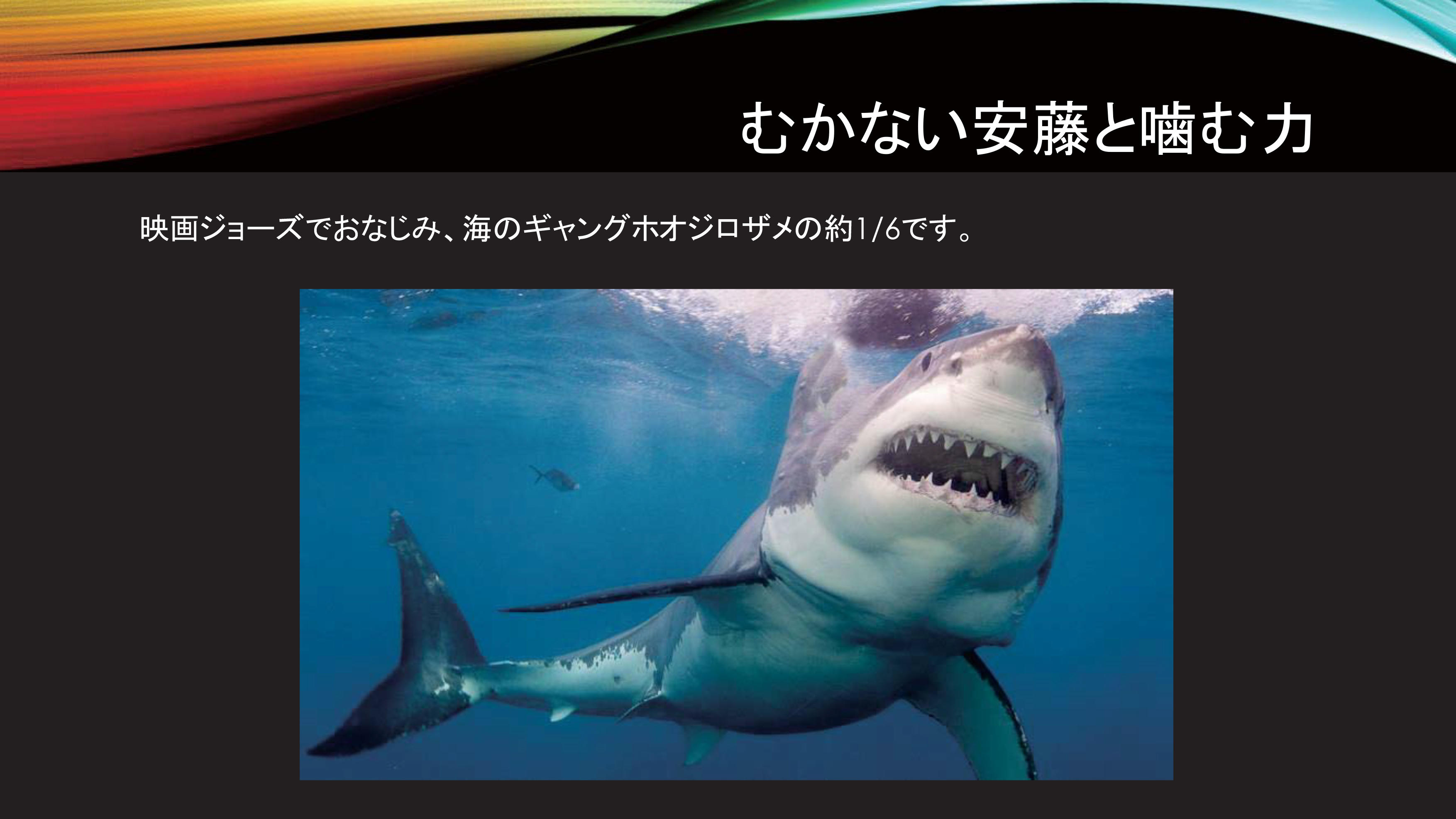 もう一つは海のギャング、サメですね。サメはね、僕の6倍すごいんですよ。一番大きなホオジロザメっていうのが、むかない安藤の6倍ぐらいのちからを持ってる。これはたぶん、エイとかむかずに食べますね。