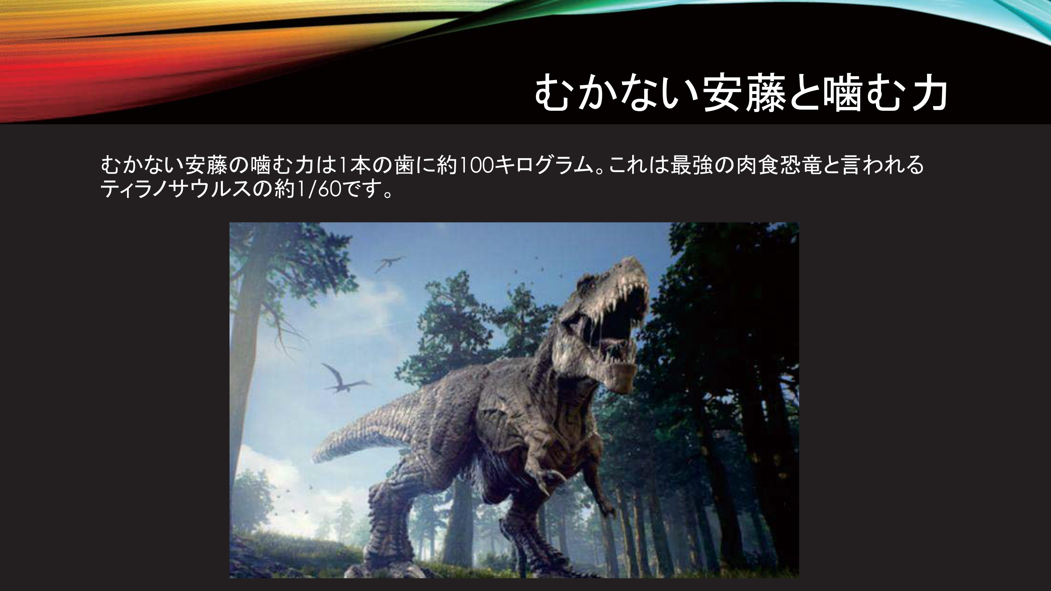 最強の肉食恐竜と言われるティラノサウルスが、約6トン。1本の歯にかかる力が6トン。それに比べるとむかない安藤は60分の1です。これに比べたら、そうですね。もうこれは古代の生き物なので、今はもう戦わなくていいんです。