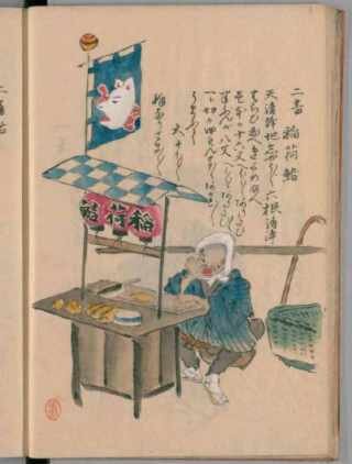 1852年に発⾏された『近世商売尽狂歌合』には、いなり寿司を売る商売⼈の姿が描かれております。
