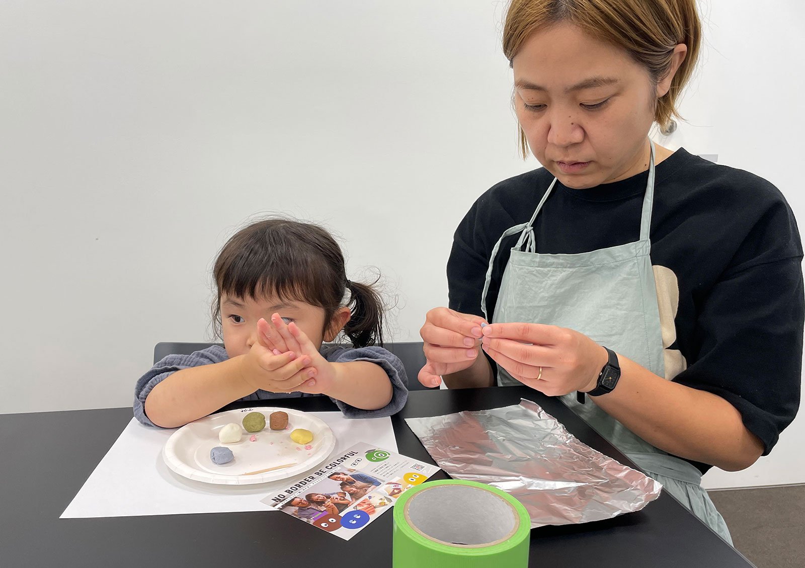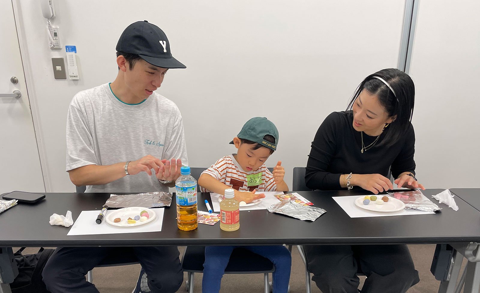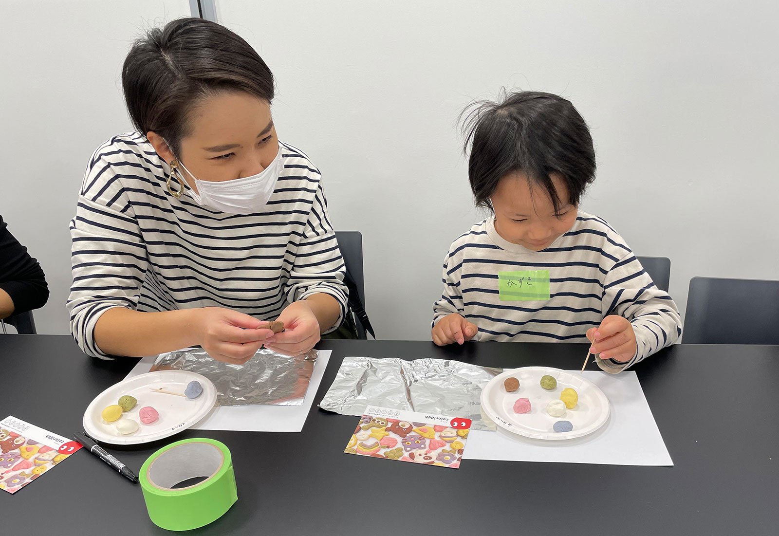 ふと気づくと、子どもはもちろん、大人であるわたしも夢中に。楽しい!形づくりが完成したものから順番に、トースターで焼いていきます。今回は特別に、クッキー生地の生みの親ひとみんが、みんなが作ったクッキーがおいしくなるように見守っていてくれました。