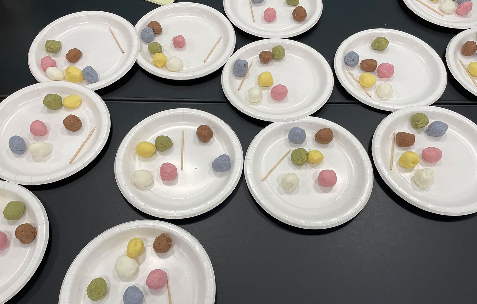 生地は全部で6種類あって、味も香りも色も全部違います。これをコネコネしてから人数分に分けていきます。こねていると漂ってくる、いい香り...。下準備はこれでおしまい。