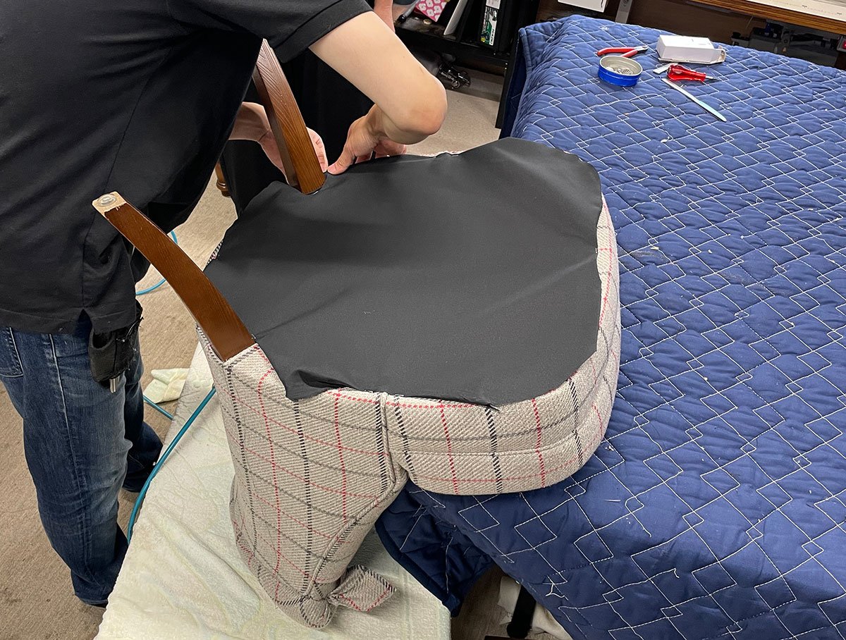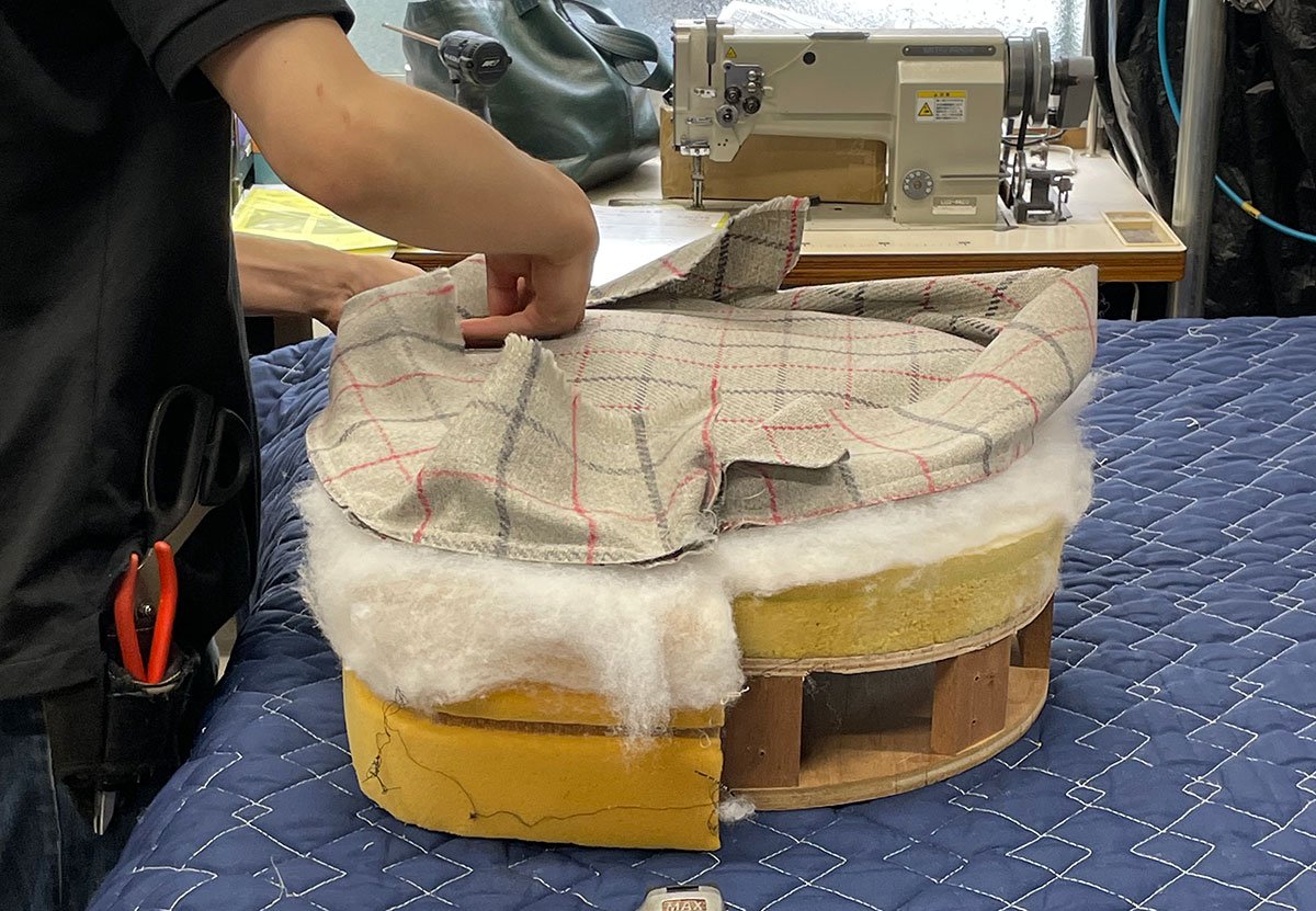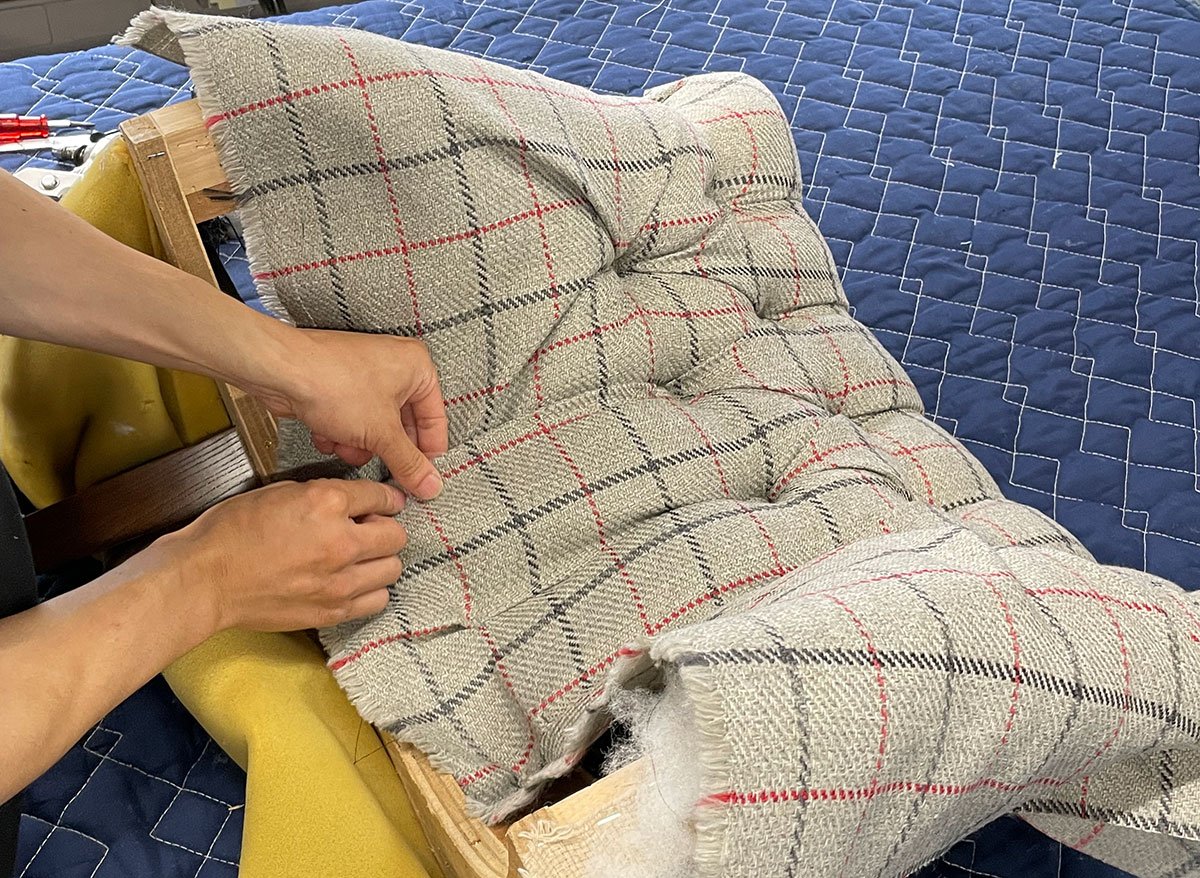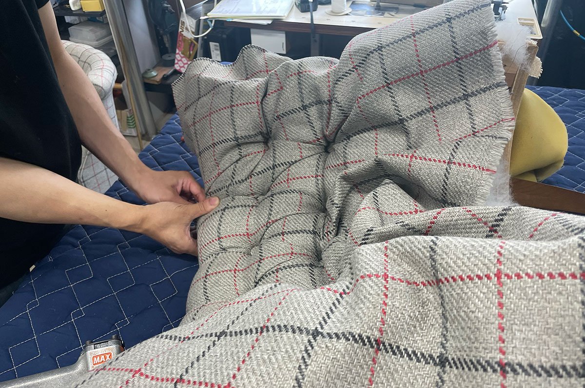 ぴったりに縫製された座面用の張り地をかぶせていきます。綿を潰しすぎないように、でもシワもよらないように。