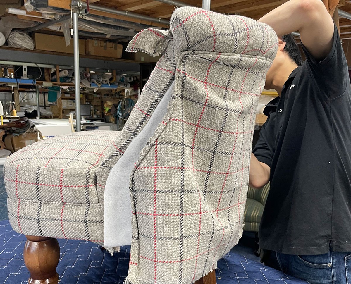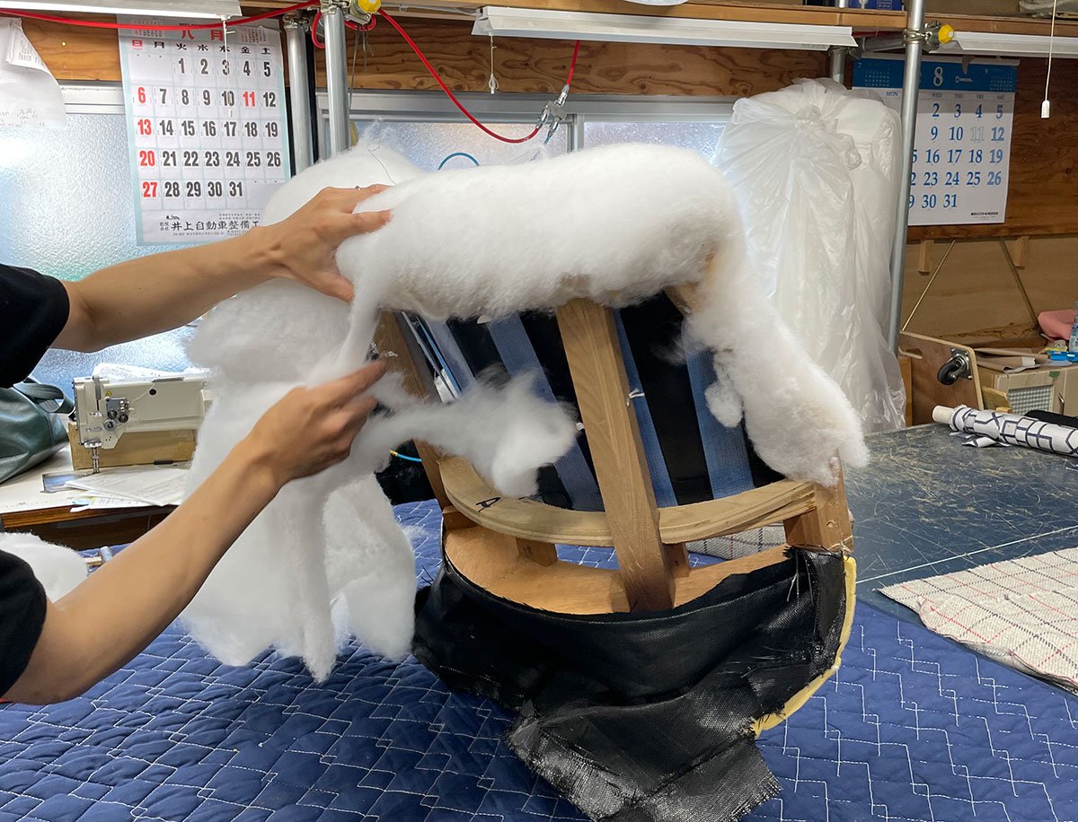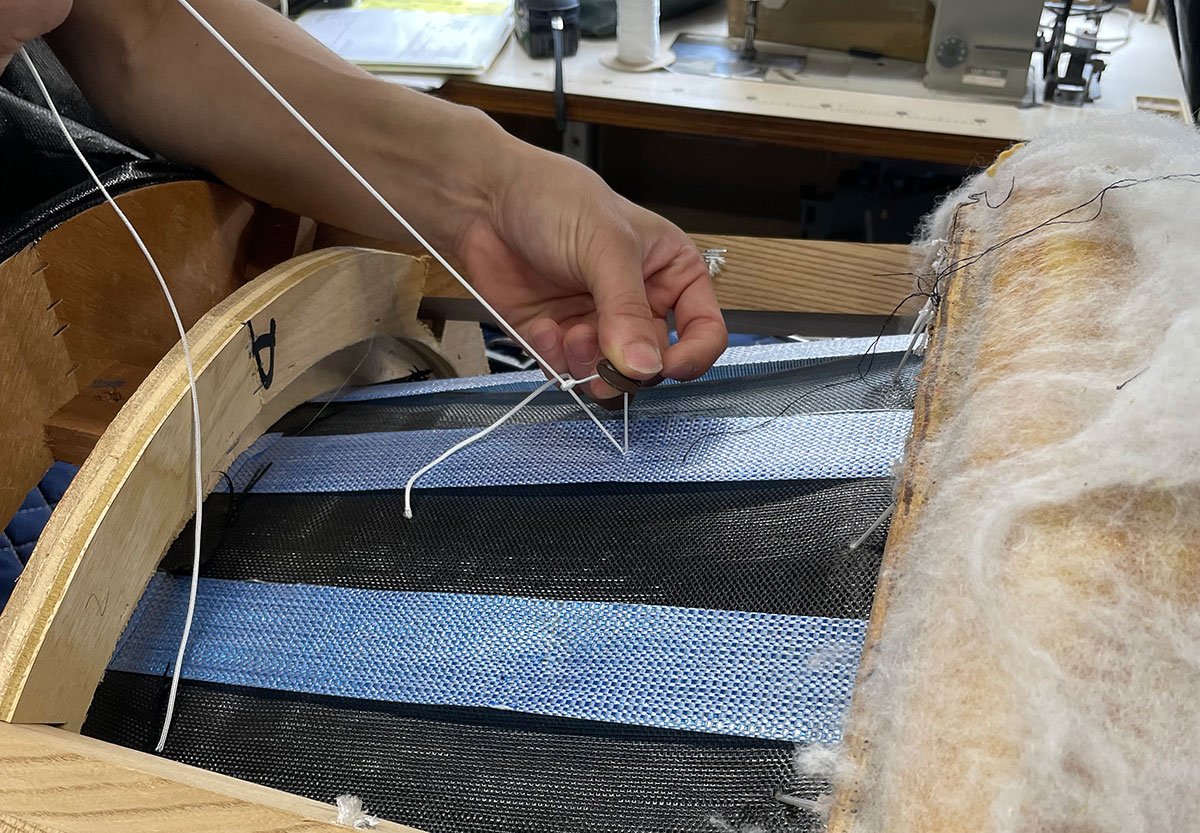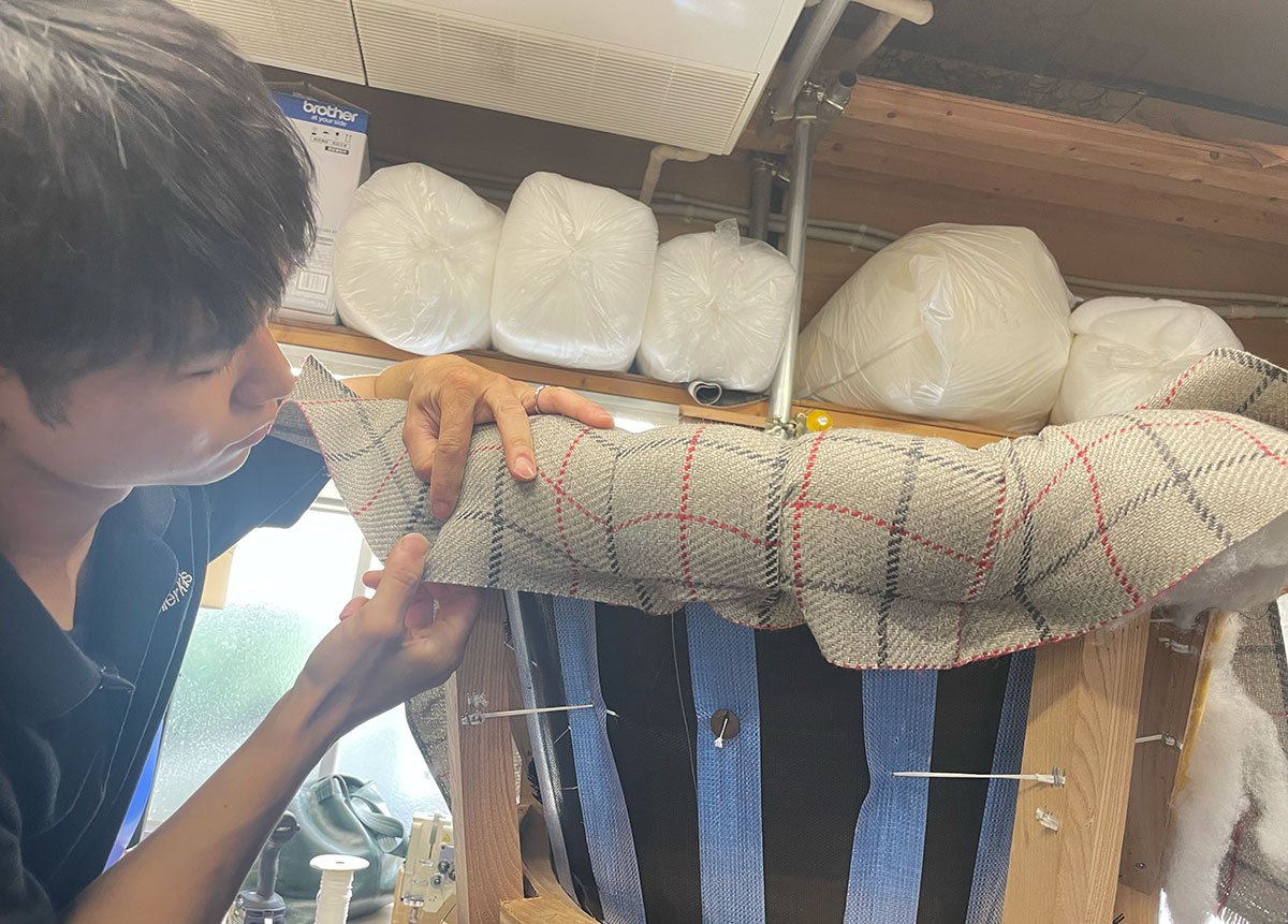 ぴったりに縫製された座面用の張り地をかぶせていきます。綿を潰しすぎないように、でもシワもよらないように。