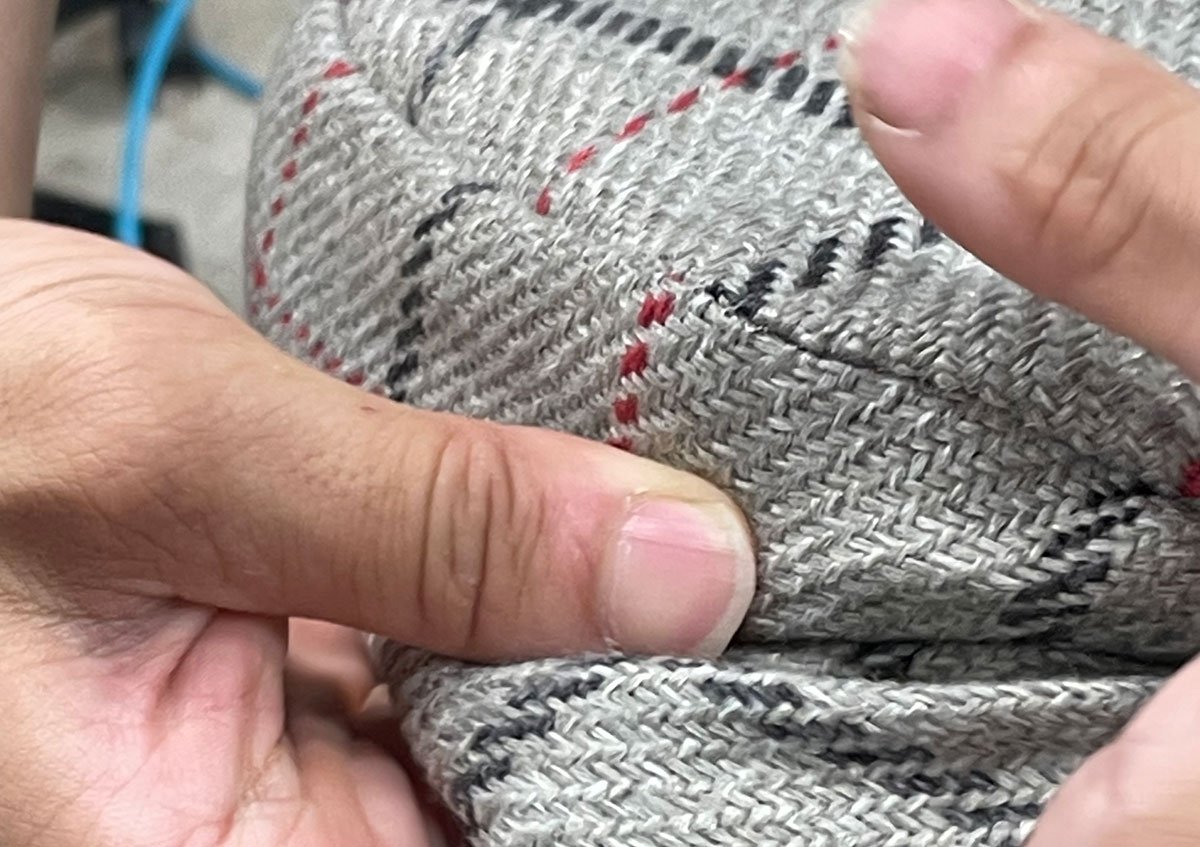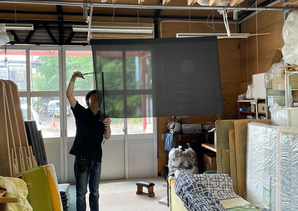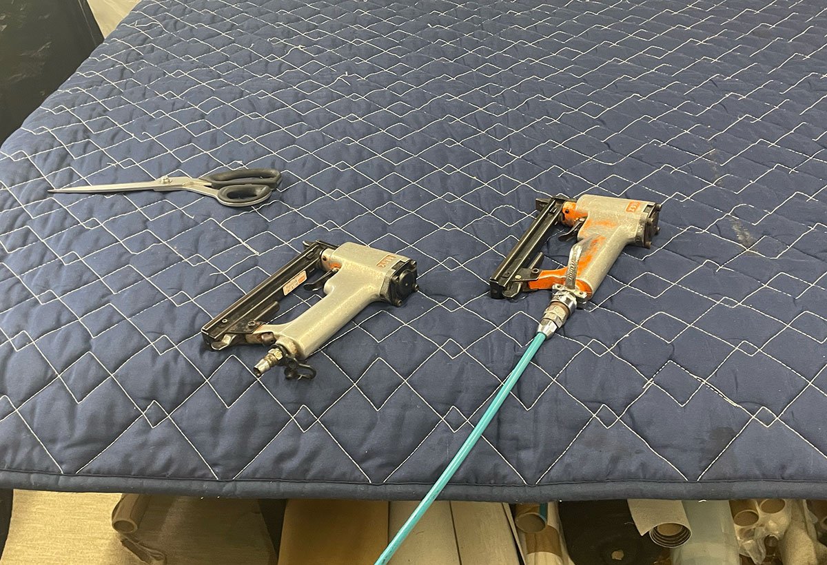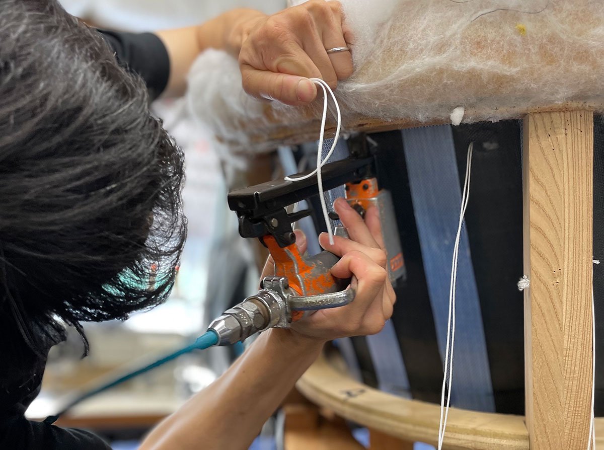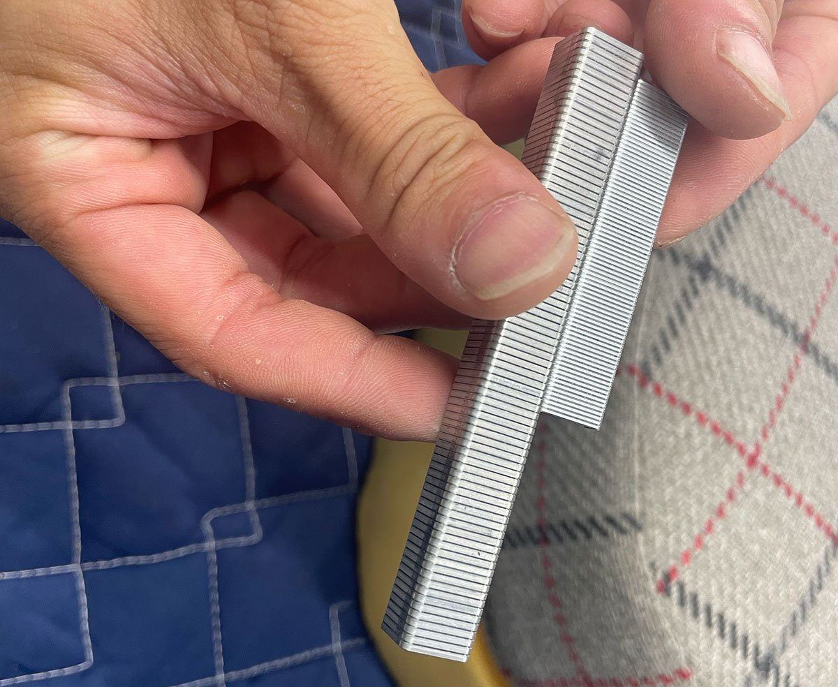 タッカーのトリガーが思ったより軽く、受け取った瞬間に空中に誤射して焦る筆者。スムーズに打っていたのは職人さんだから(そりゃそうだ)で、しっかり力を入れて押し付けないと、針が浮いてしまってやり直し。でも強すぎると布を痛めちゃう。ひと針打つのに10倍くらいの時間がかかります。