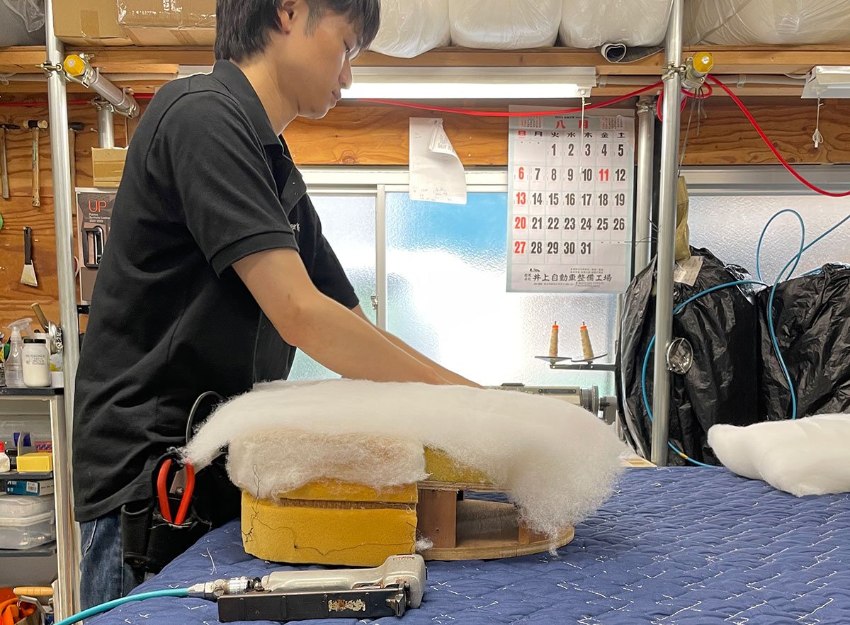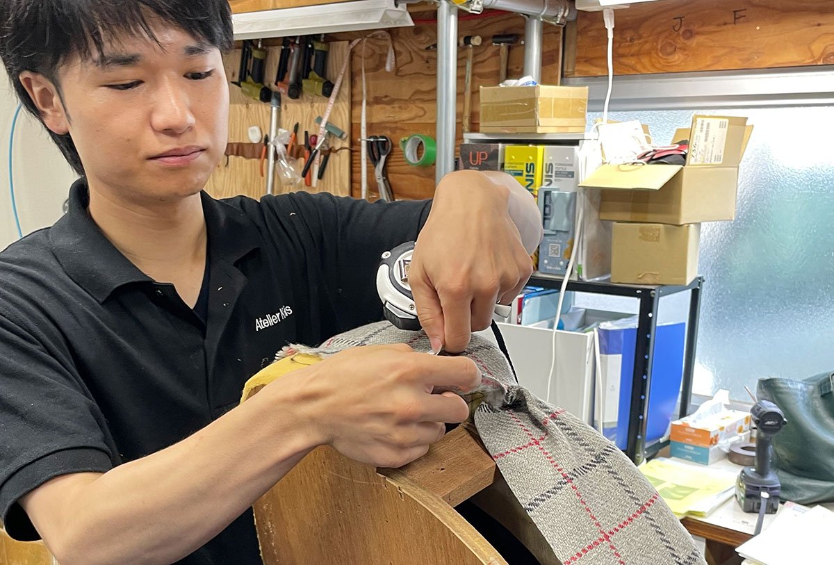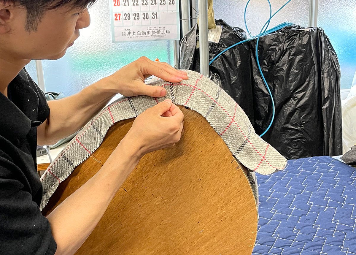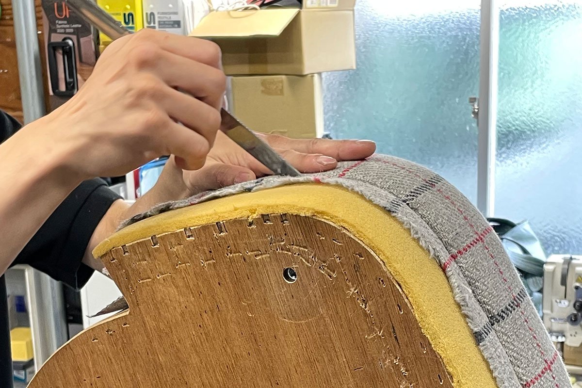 前編では、もともとの張り地を剥がす体験をレポートしましたが、今回はいよいよ新しい張り地を張っていく工程です。