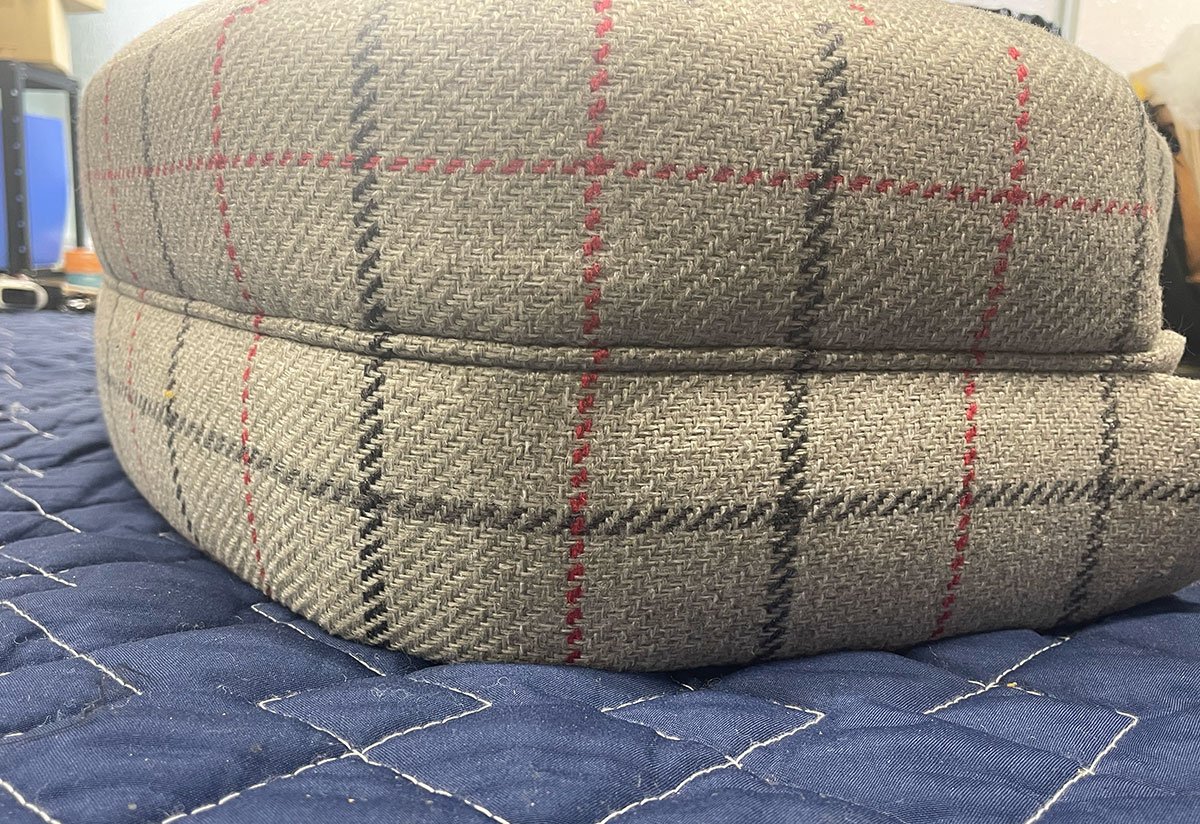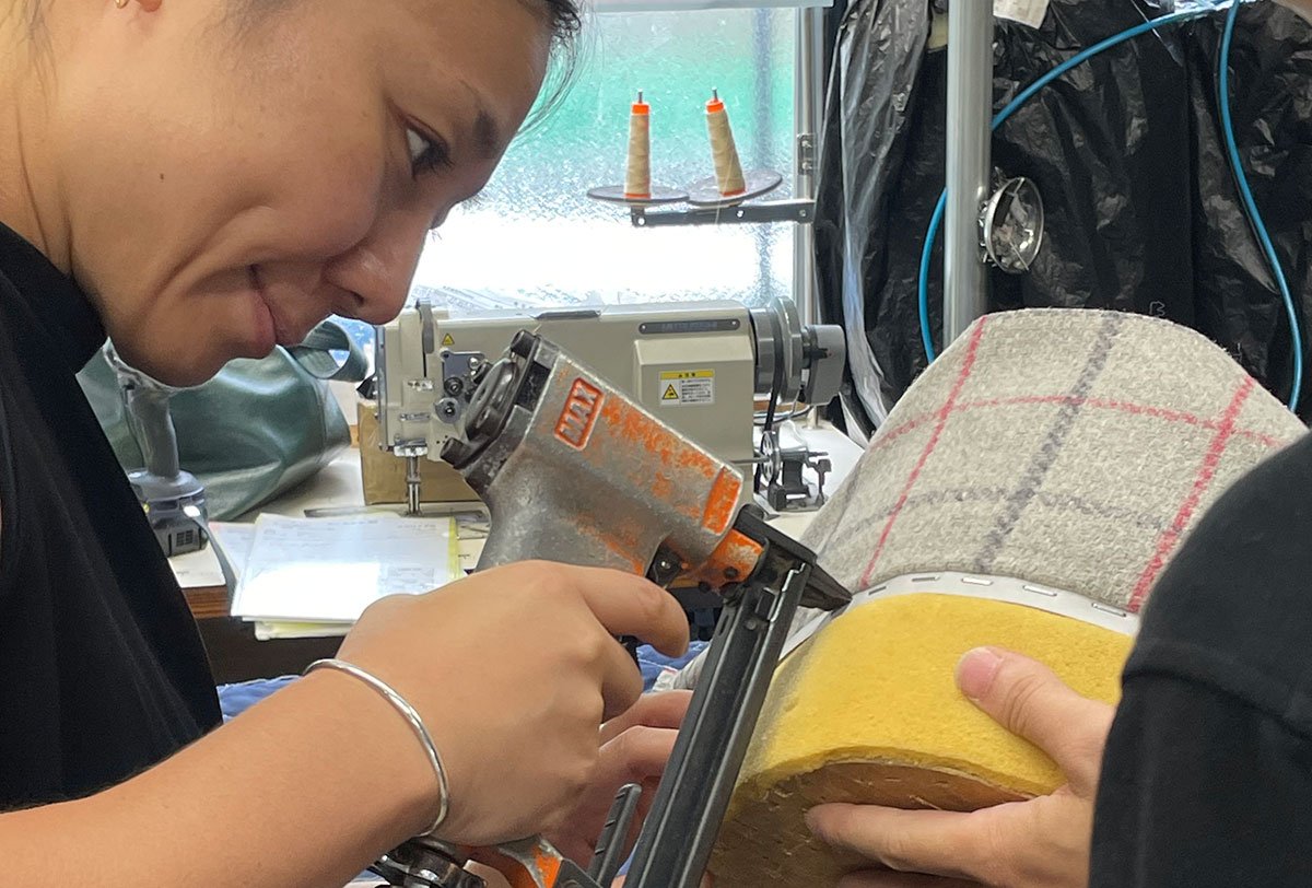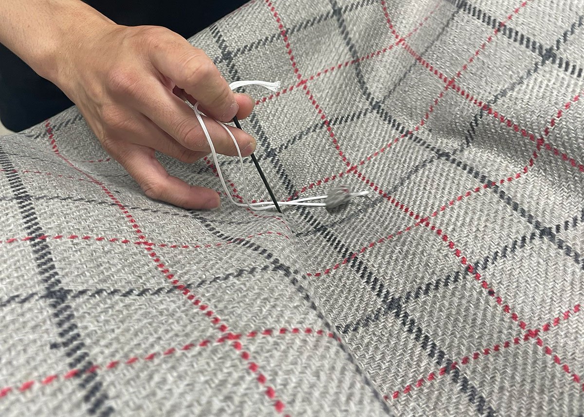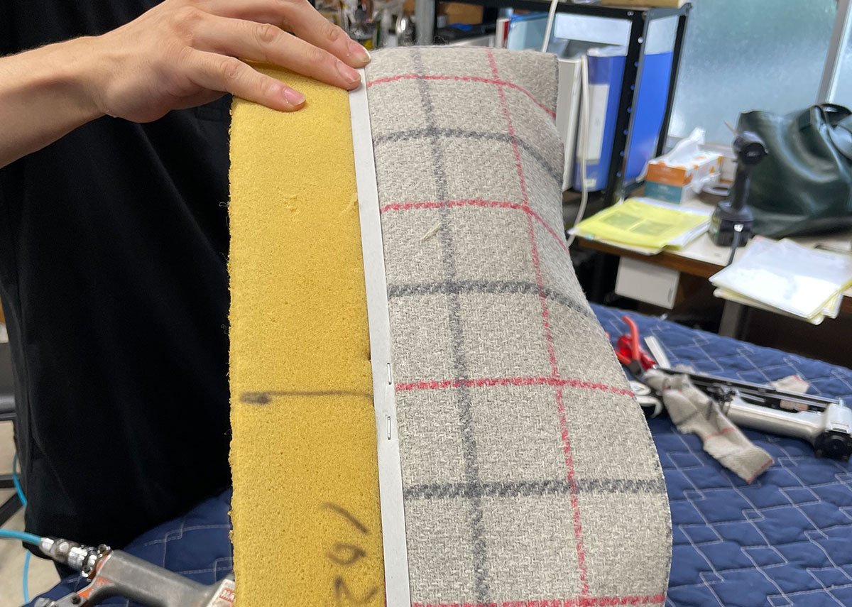 お気づきでしょうか座面下側。まだ覆われていませんね。側面は2つのパーツを張っていくんです。つなぎめのパイピングがきれいに出るように、段ボールの芯で折り返し裏側から止めます。ここでも、上部の柄とのつながりに注意して、慎重にあわせていきます。