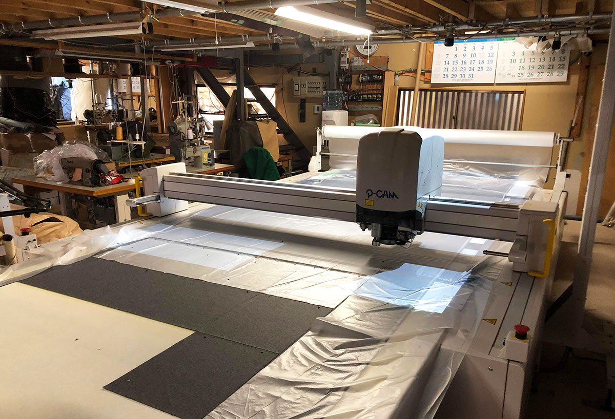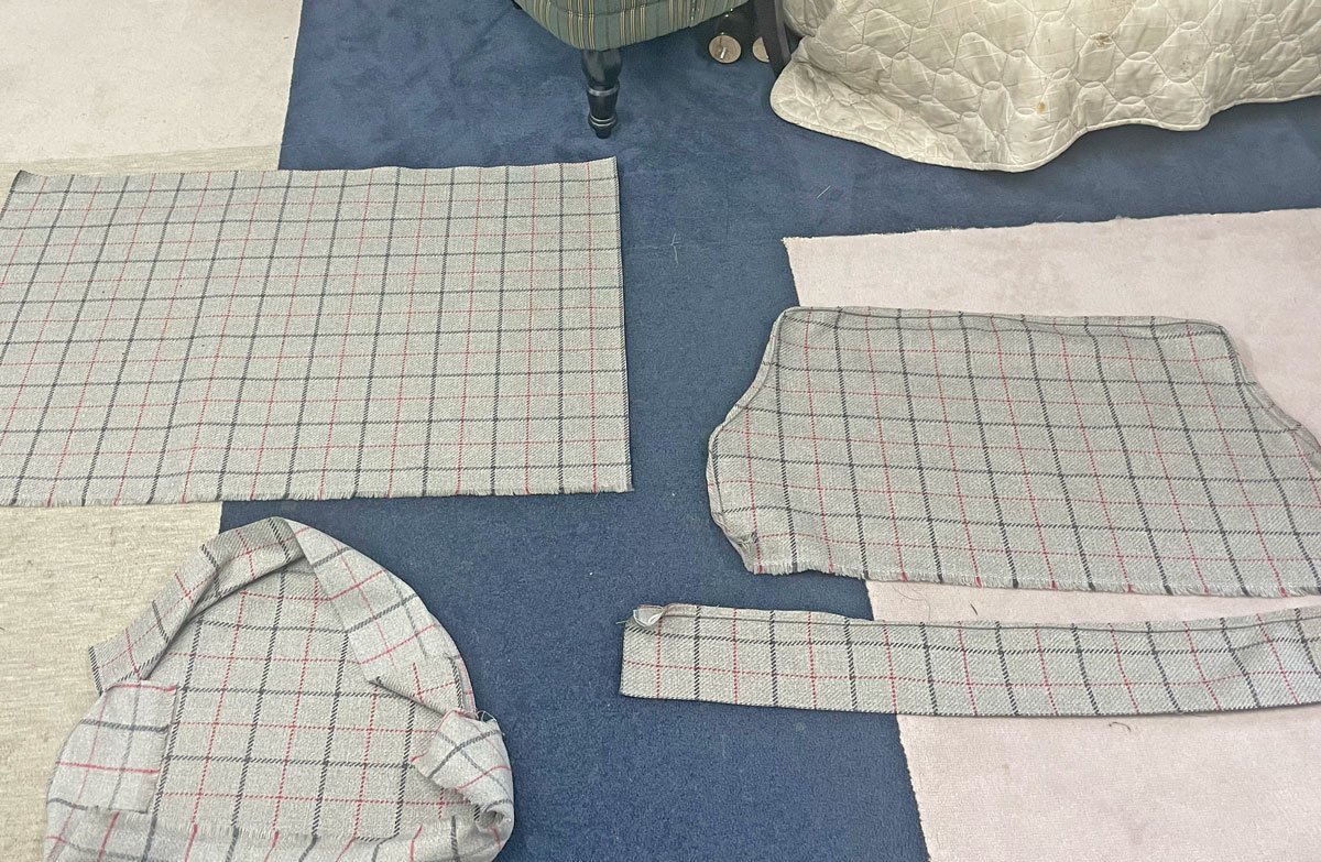 すでに裁断・縫製済みの張り地を並べて確認。前回剥がした張り地をもとに、4つのパーツができあがっていました。