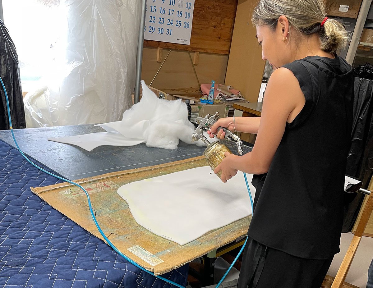 慎重に外した背面のウレタンですが、残念ながらくたびれ過ぎていて再利用ならず。布にあわせてカットした、新しいウレタンにスプレー糊を噴射して貼りつけます。これもグリップが絶妙で、緊張して肩上がり過ぎな筆者。