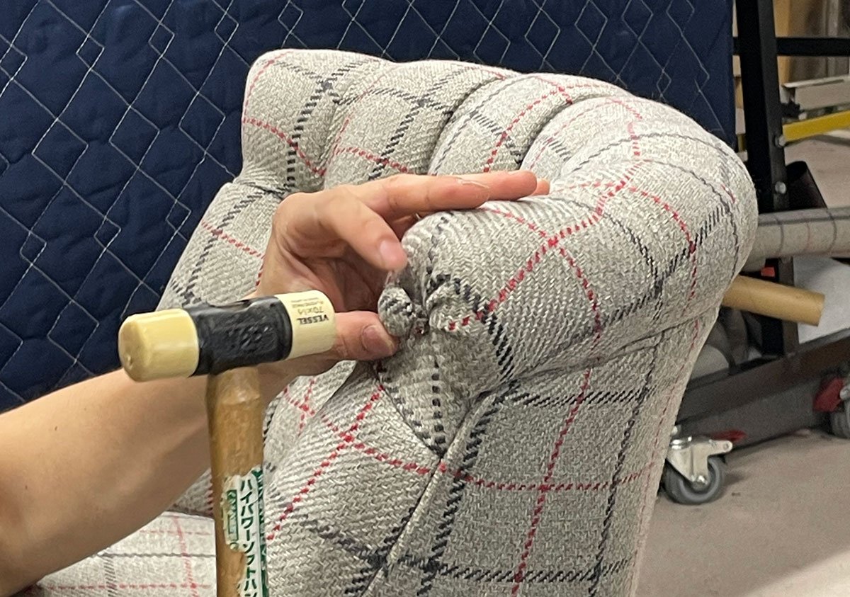 下側をとめていくときも、ひだの内側で見えなくなる色味を揃えていきます。このソファの難易度、レベル10段階でいったらいくつ?と伺ったところ、「レベル6」という回答でした。(ちなみに剥がしのアツヤせんせいの回答はレベル3。)
