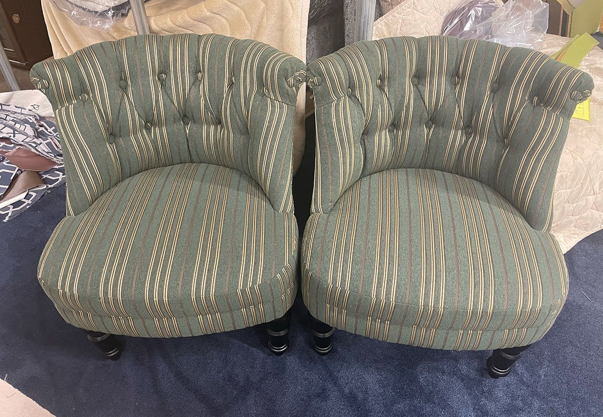 お願いした4脚のうち、すでに3脚は張り替えが終わっており、残すはあと1脚。その張り替えをライブで見学させていただけるとのこと。こちらはボーダー柄でお願いした2脚。生地サンプルを見ているだけでは想像しきれなかった仕上がりに大満足です!かわいい!