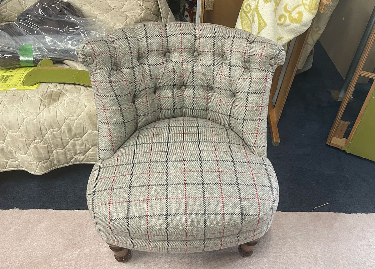こちらはチェック柄でオーダーしたもの。かわいい!それに、なんだか張り替え前よりぷっくりとして、座り心地もよさそうに見えます。気のせいかな。