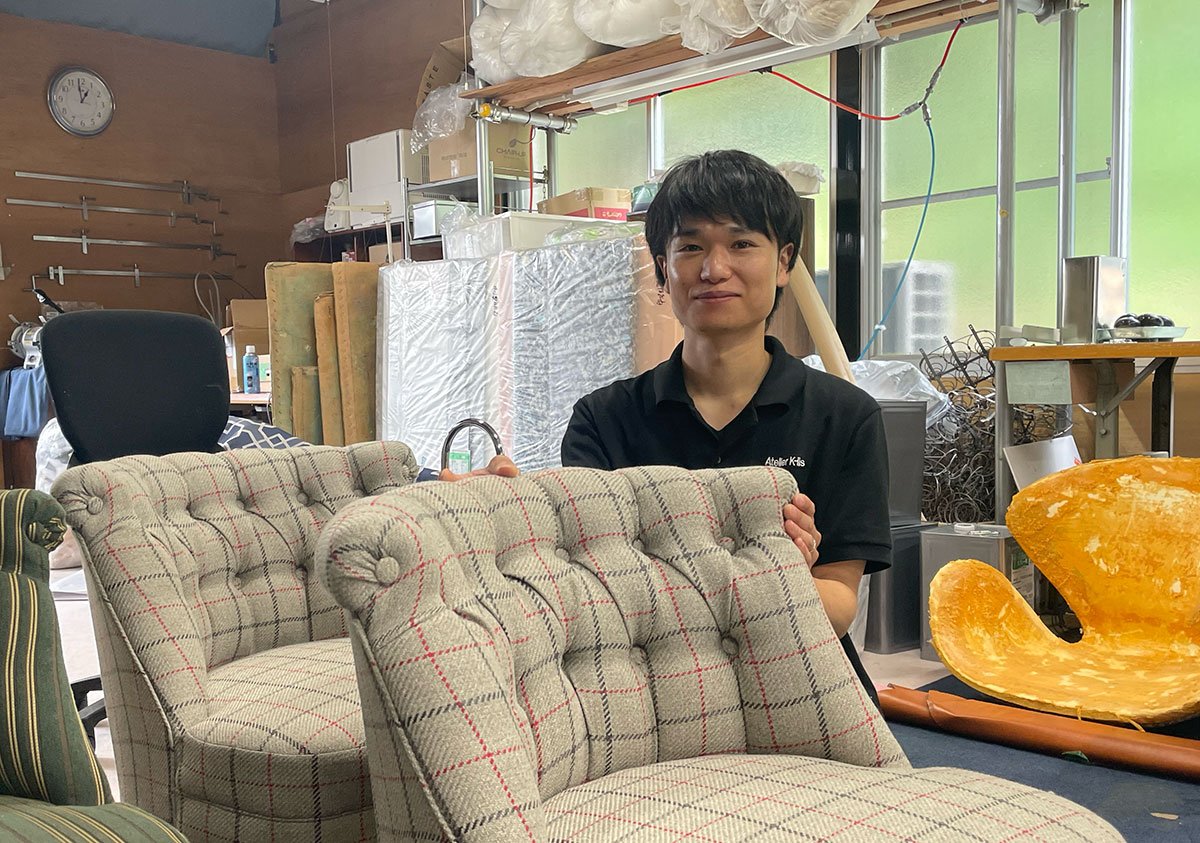 こうして解体から仕上げまで体験させていただいたことで、いっそう愛着が増したソファ。『生活の解体展』の醍醐味を、身をもって体験できました。また今回、体験を受け入れてくださった東加工所さんは、現代表の太平さんのお父さまが、副業として始められた家業。前述の通り、以前は釘とハンマーでしていた椅子張りはまさに職人技で、その二つの道具さえあれば全国どこででも仕事ができるということで、本業のあいまに張り替えをしていたのだそうです。いまは、家具メーカーからの依頼も個人のお客さまからの修理も、おなじように承っているそうなので、張り替えを検討されている方はぜひ、WEBサイトをチェックしてみてください。